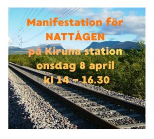 Manifestation för nattågen på Kiruna station 8 april kl 14 – 16:30. Var med och visa att vi är många som vill ha kvar nattågen!